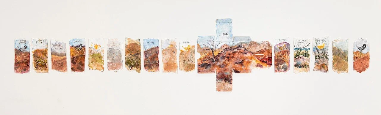 ‘Just Add Water’ is a response to my Country Arts residency to Grindell's Hut in Adnyamathanha Country 2019. Observations of the effects of four years without rain. Of the jewels of living things that manage to survive still. Of learning from local Adnyamathanha Elders and Rangers about the flora and fauna, and from a scientist from Deakin University about the incredible adaptability of Idthi, the Zebra Finch, who sing to their eggs a different song in hot arid conditions so the chicks develop differently and better adapt to drought. Learning from my dad about the geology of the area and the fascinating connections between drawing and geology. And the generous gift of ochre from Yalmarralpana Ochre Pit from Uncle Cliff Coulthard. Ochre that's now been smeared, scraped, splattered and crushed across every artwork I made, almost all of which is created on recycled surfaces including food packaging from our time there. The spectacular powerful timeless beauty of it all. Waiting for rain. Hoping it doesn’t come too late.